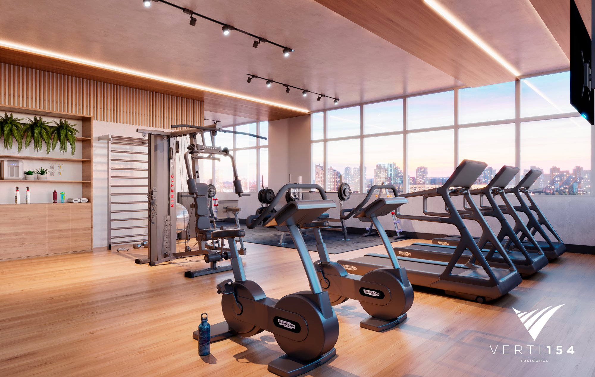 Academia com vista panorâmica equipada e com gerador de energia.