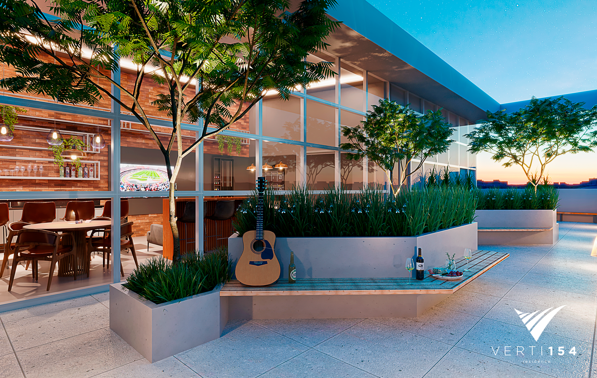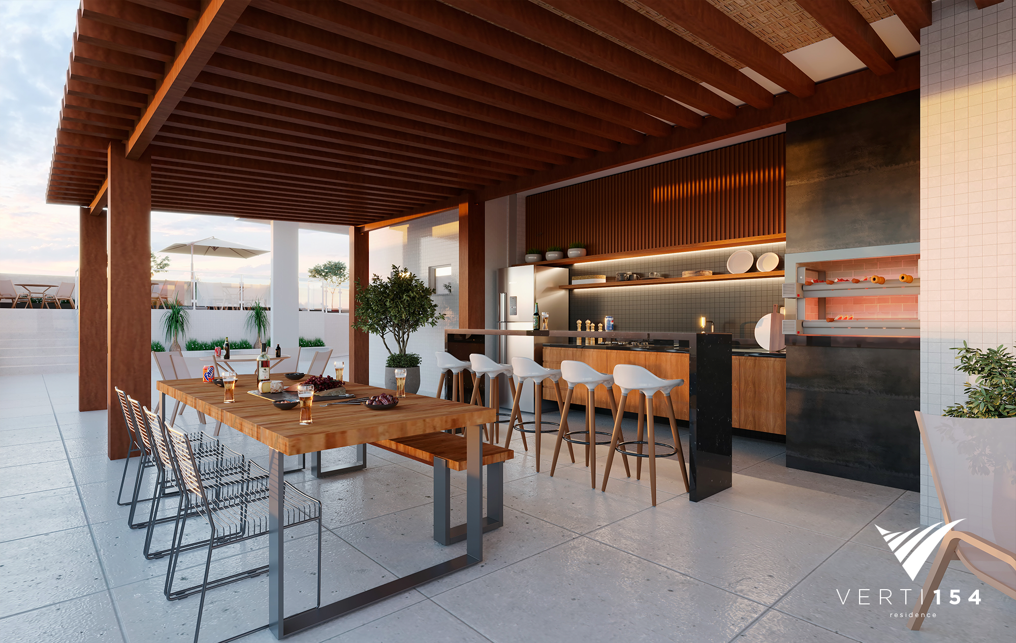 Área gourmet externa com churrasqueira integrada.